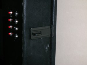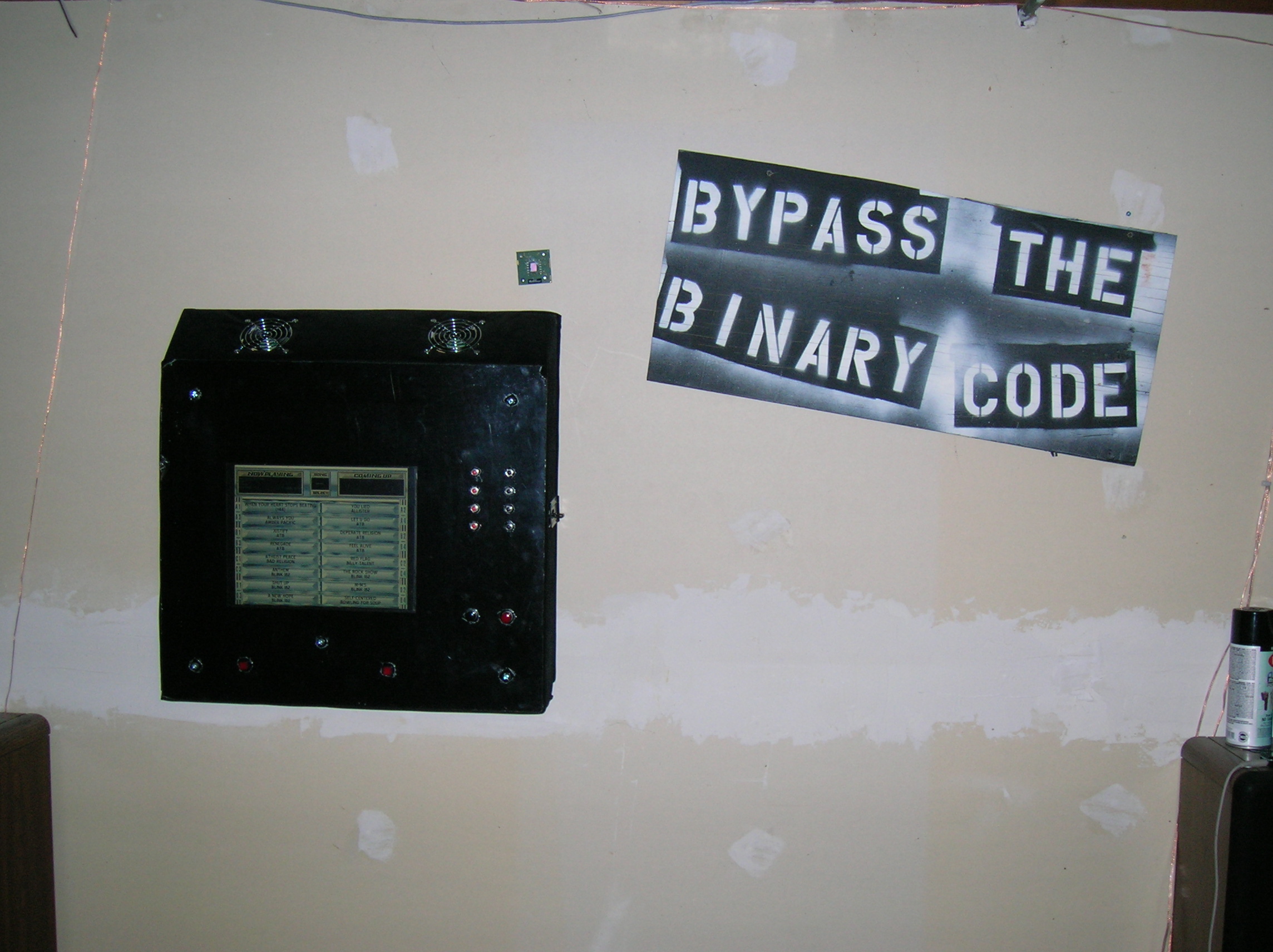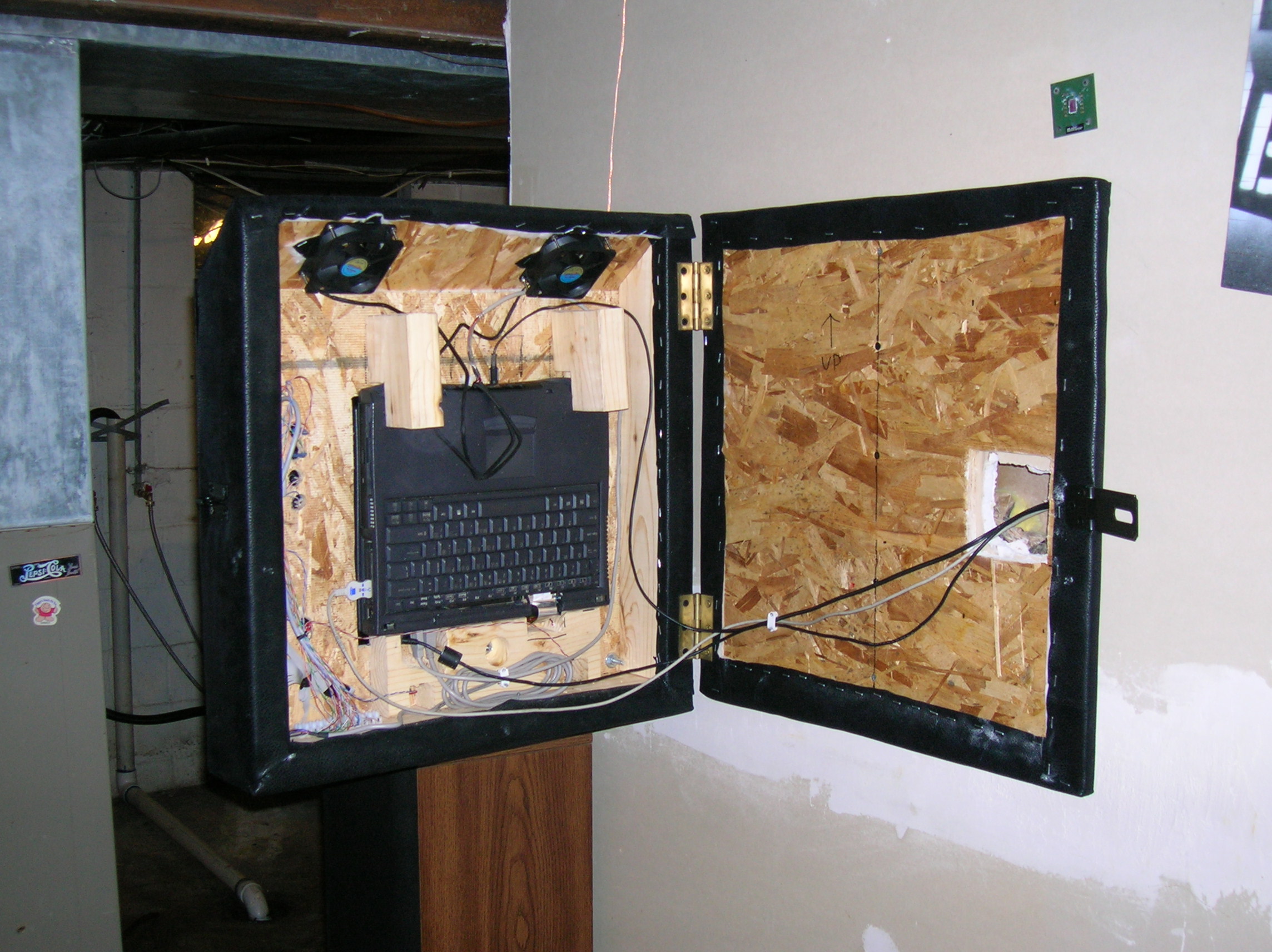 Inside view. Made hole in wall to run wires into other room for power/network/audio out.