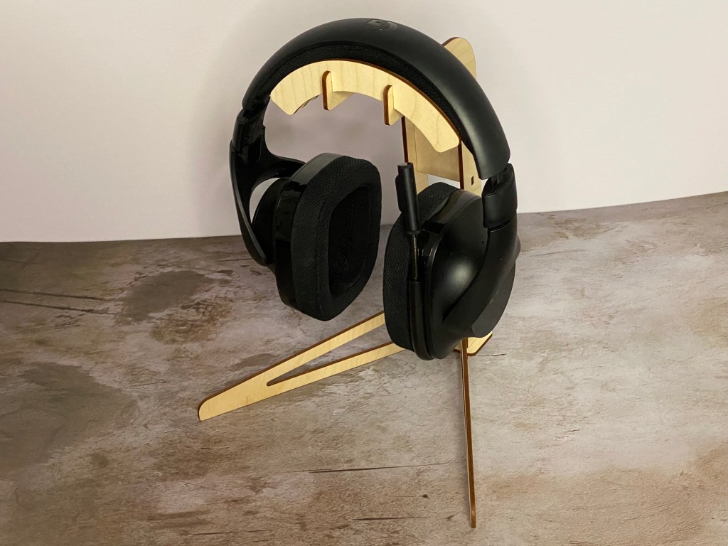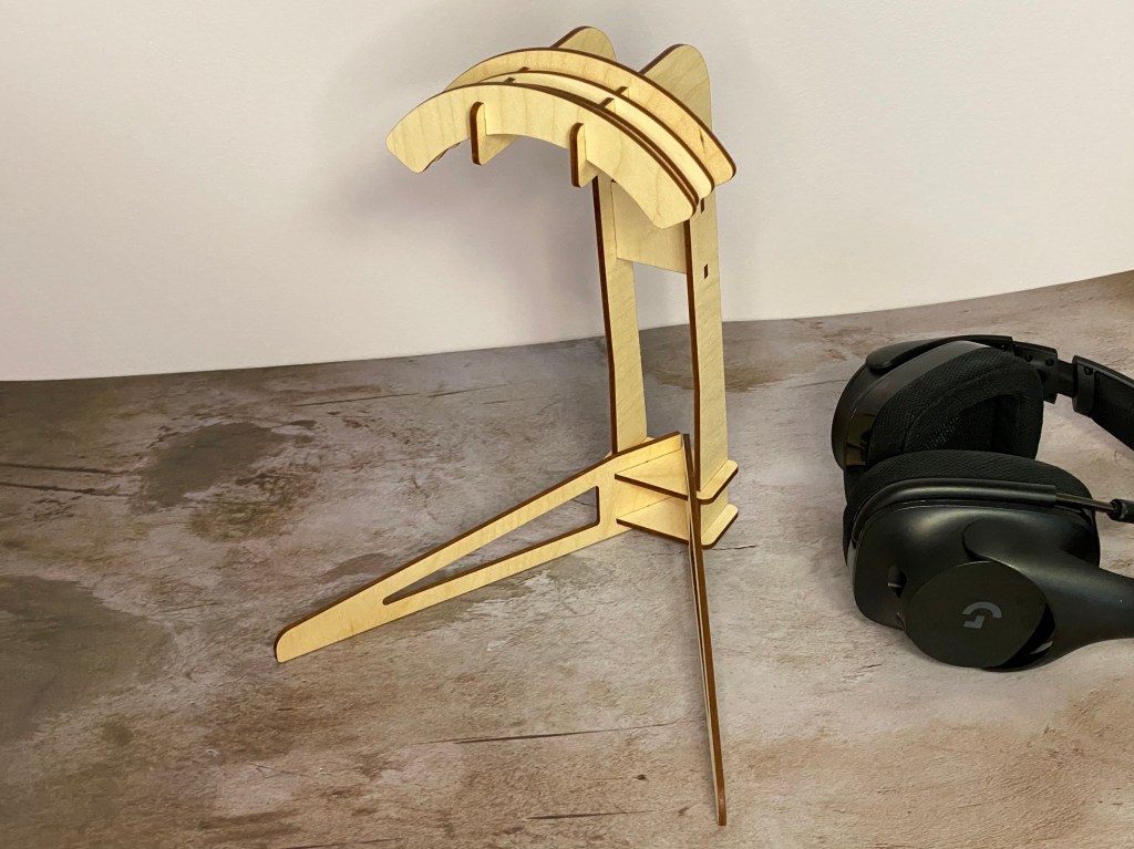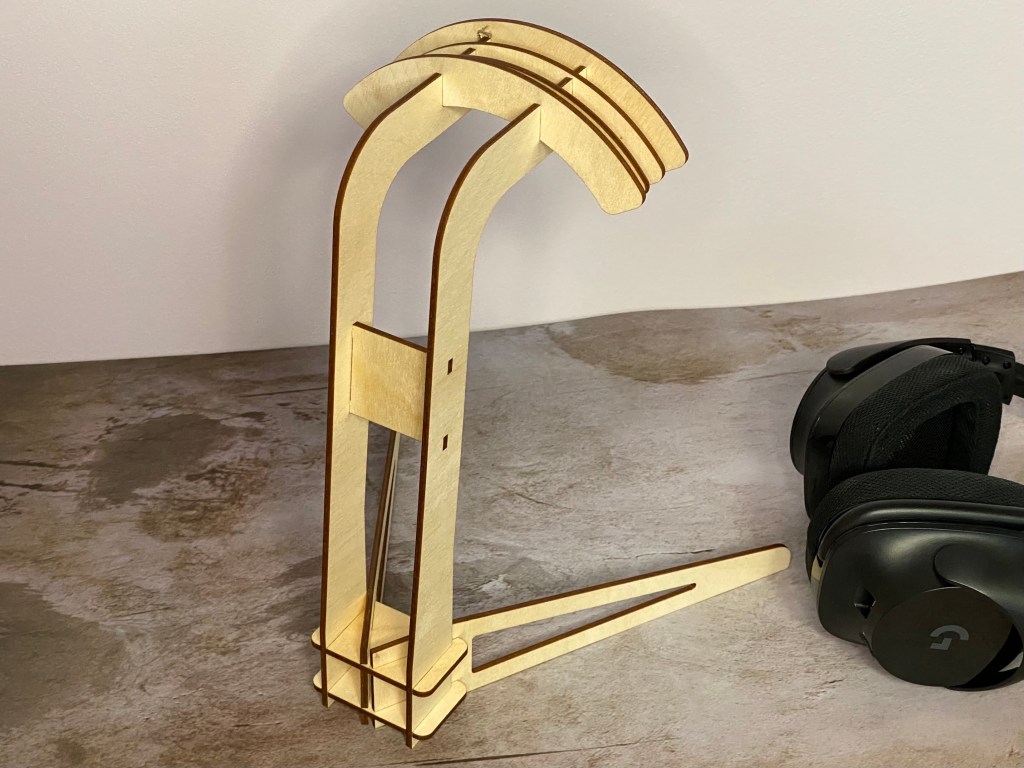 Keeps my Logitech G533 Wireless Headset up off the desk. Designed in Fusion 360, made of 3mm baltic birch, cut on Glowforge Basic