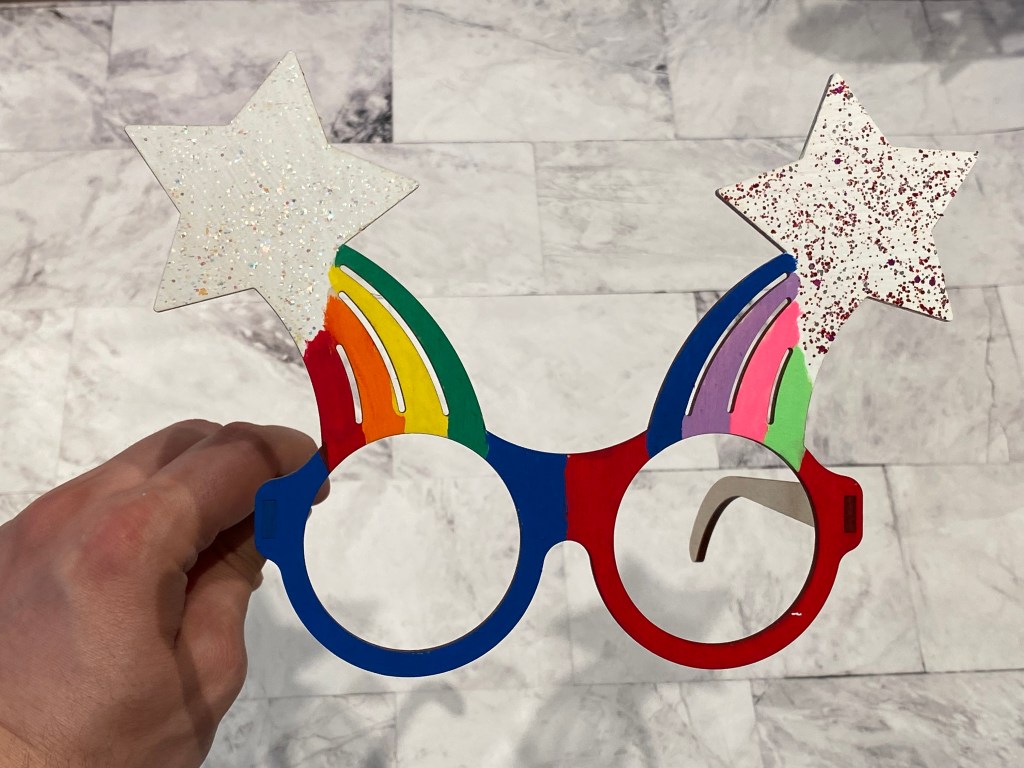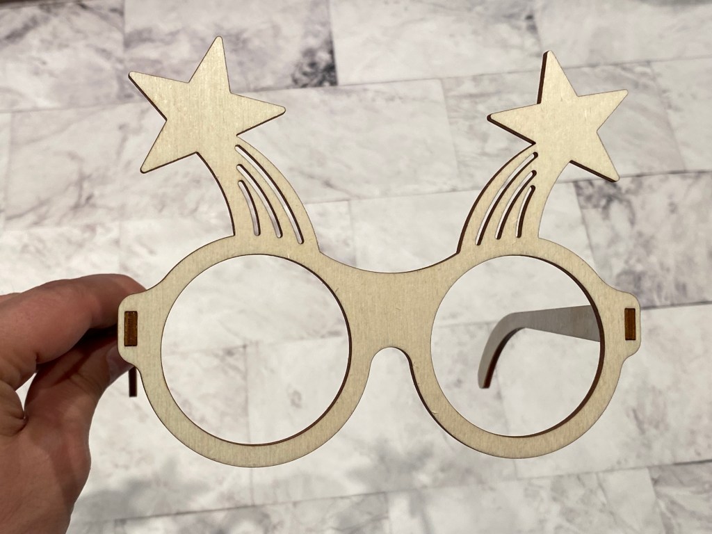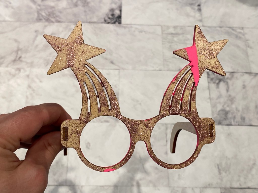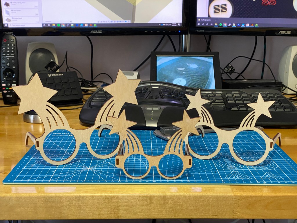 Fun glasses with shooting stars on top, in 3 different sizes. Designed in Fusion 360, made of 3mm baltic birch, cut on Glowforge Basic