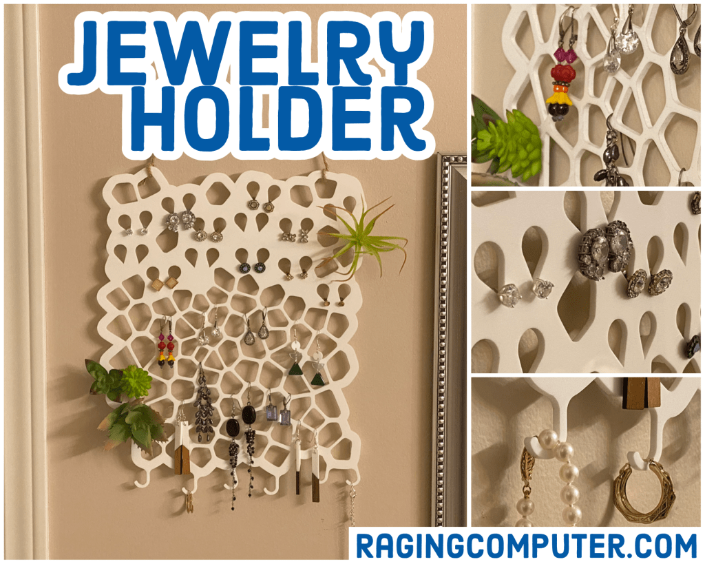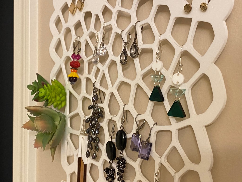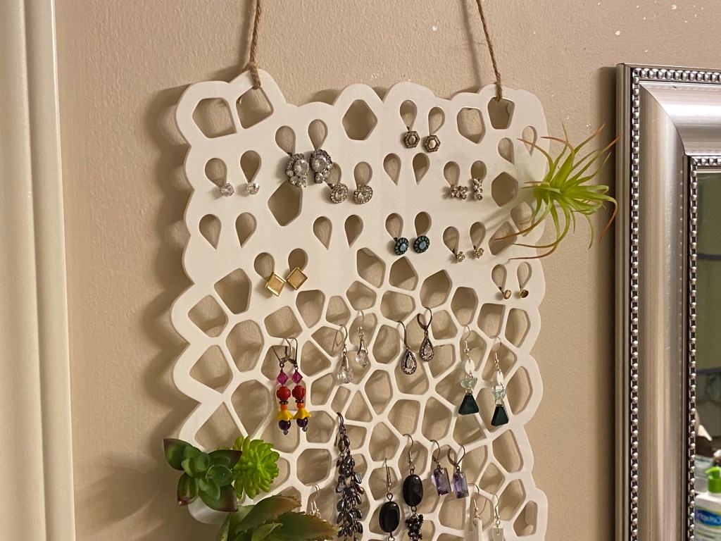 My wife wanted a place for the jewelry she wears regularly. Our house has been invaded by geometric shapes recently, so she wanted something more organic this time. I had recently found the Voronoi Sketch Generator for Fusion 360, which is perfect for this. My wife loves succulents, so I hot glued a couple on to complete the look.