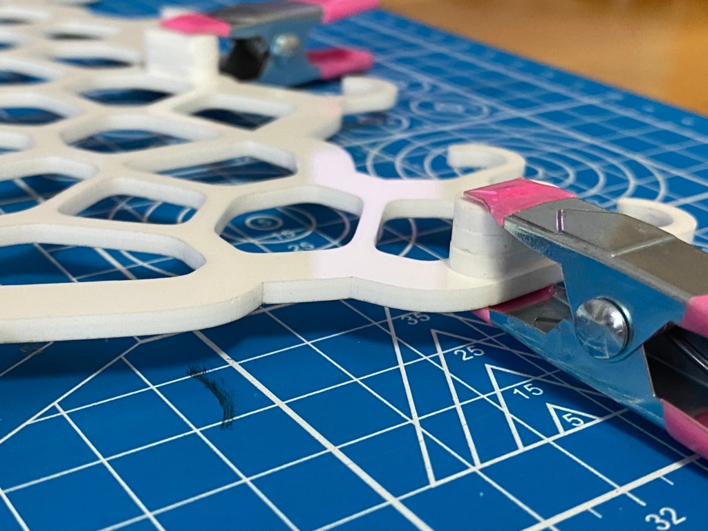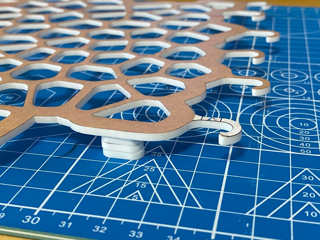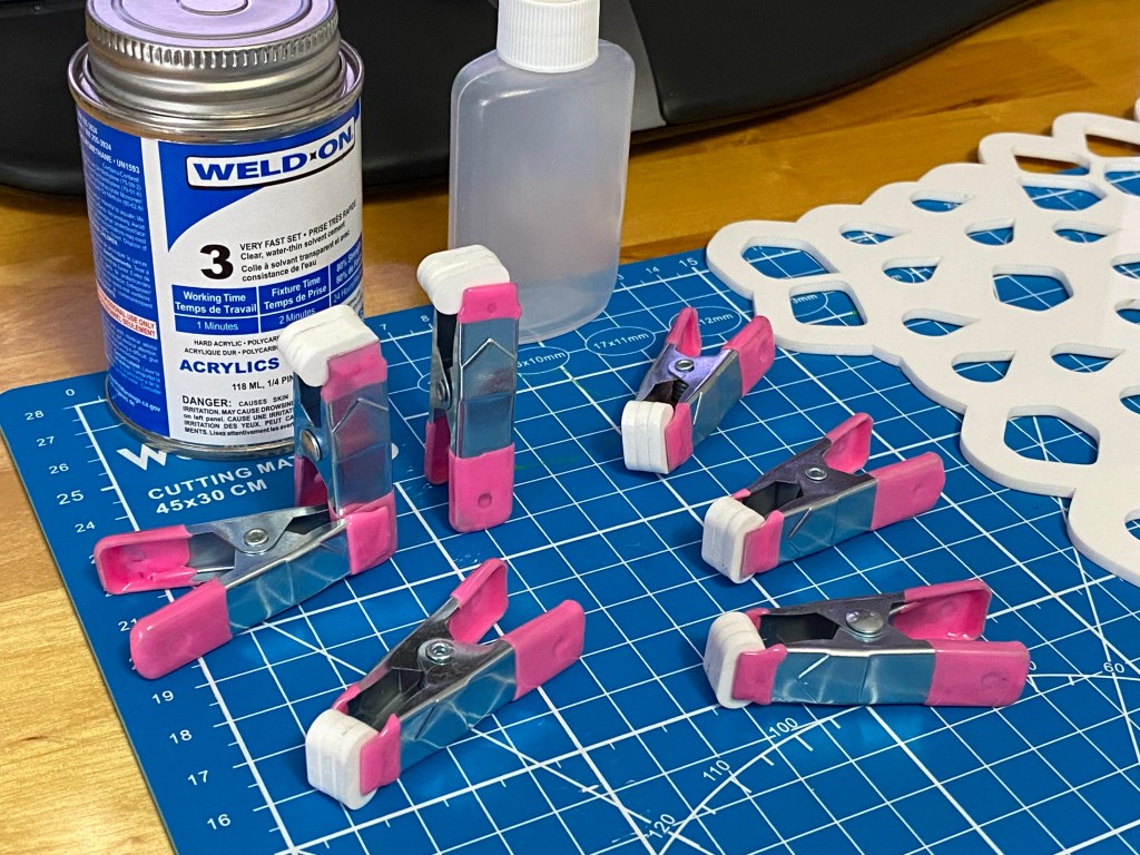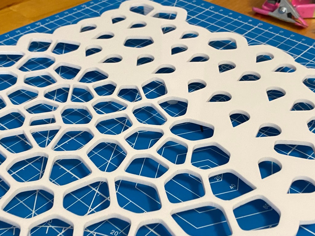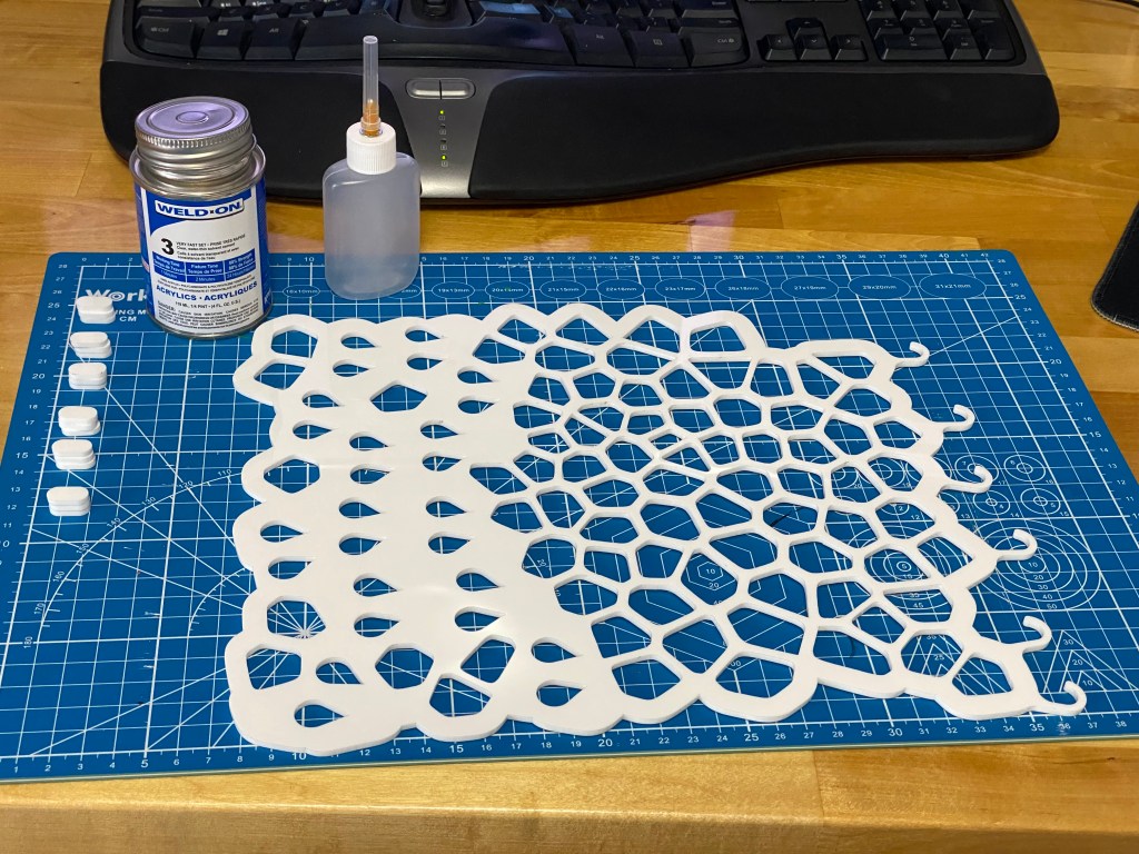 Designed in Fusion 360, modified in Adobe Illustrator, cut from 1/8in white acrylic using a Glowforge Basic