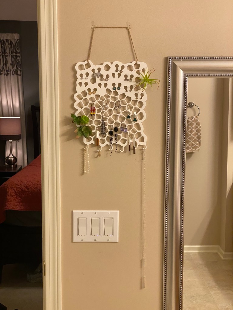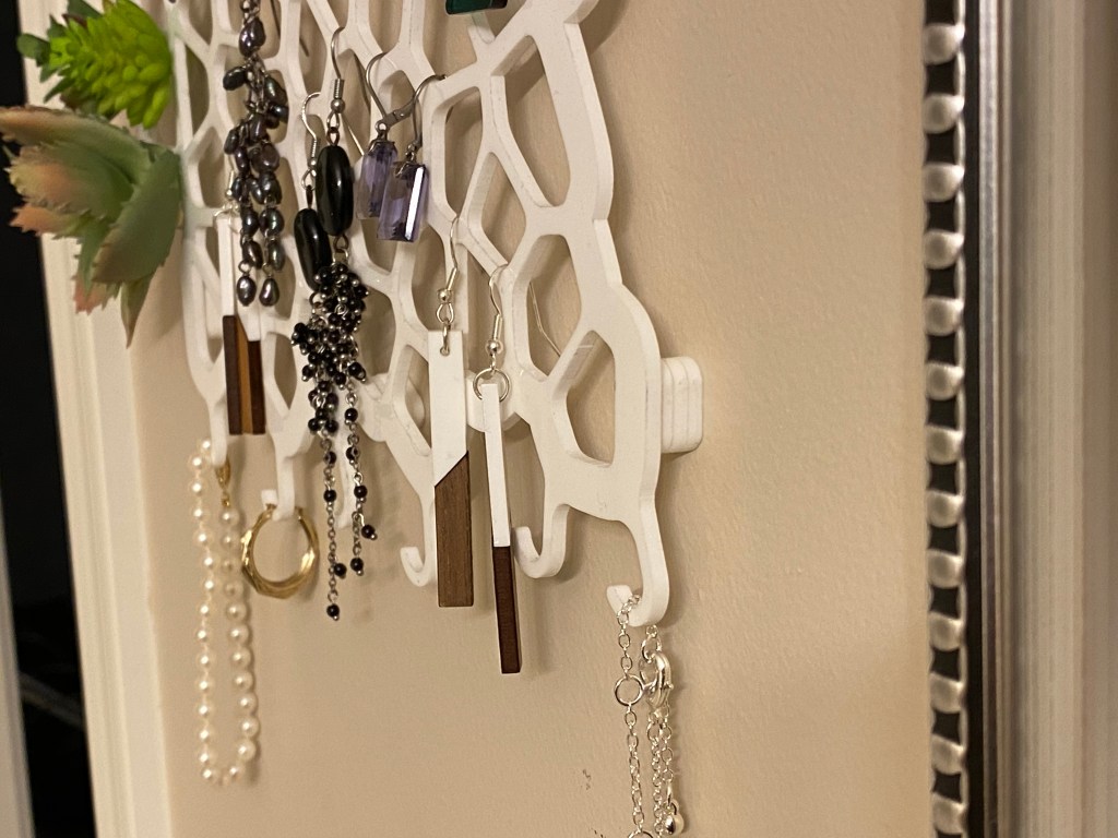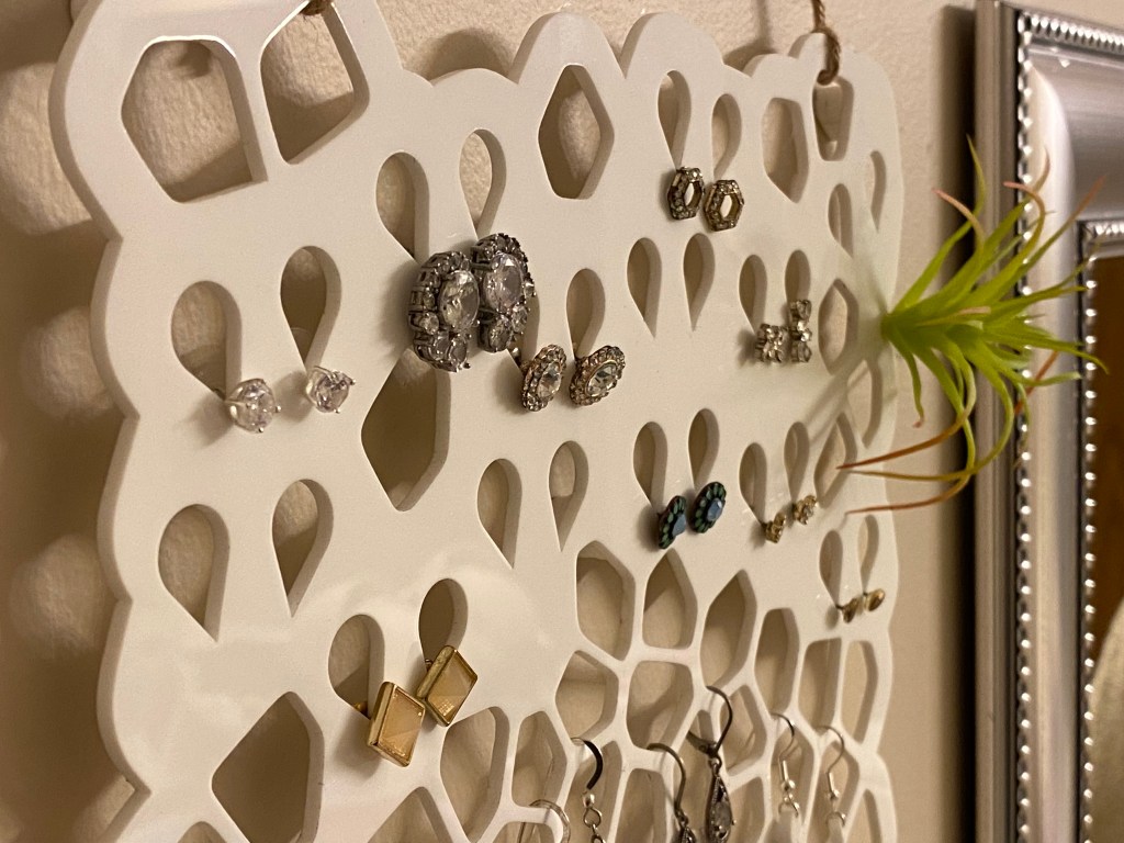 The inverted teardrop shape holds stud earrings firmly in place. The irregular openings are great for earrings with hooks. The hooks at the bottom are good for hoops, necklaces, bracelets, rings, whatever.