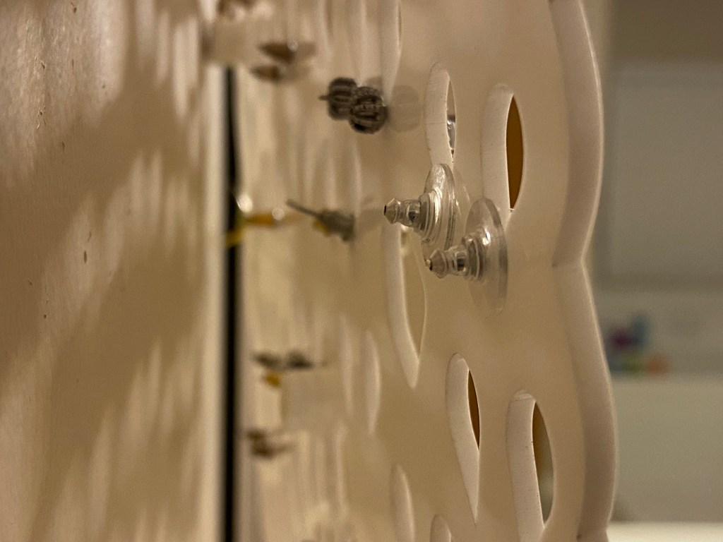Assembly is pretty straight forward. There are 18 ovals that need to be stacked 3 tall and glued to the back so there’s enough room for the earring backs.