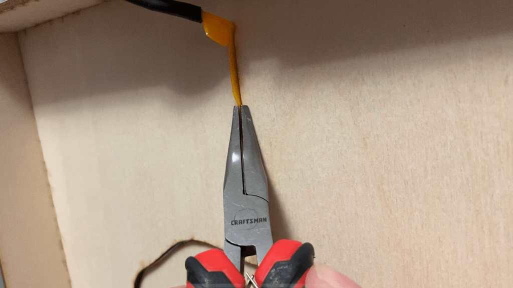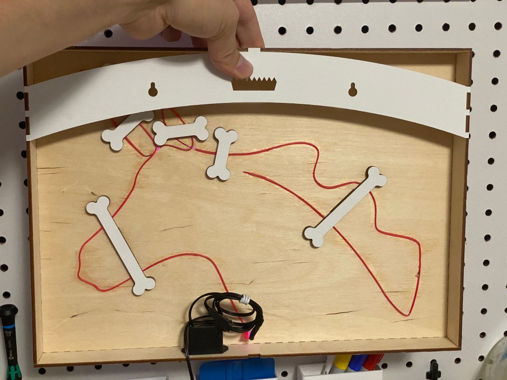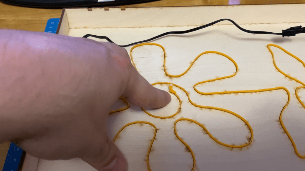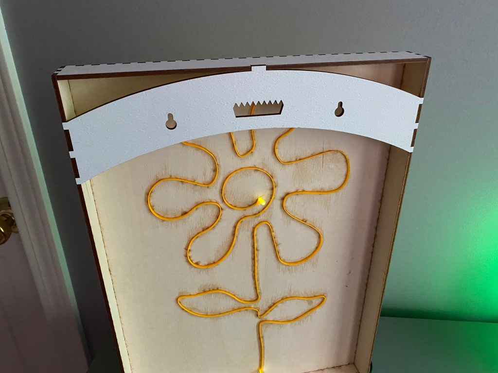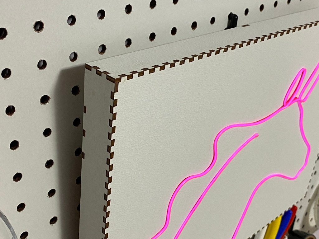 Insert the EL wire through the starting hole, notch the sewing edge so it can fold and sit flat. Insert sewing edge into slot through the entire design. Insert the free edge through the ending hole. Trim excess on the back. Push design flat and use A LOT of glue to hold the sewing edge in place and stiffen the piece.