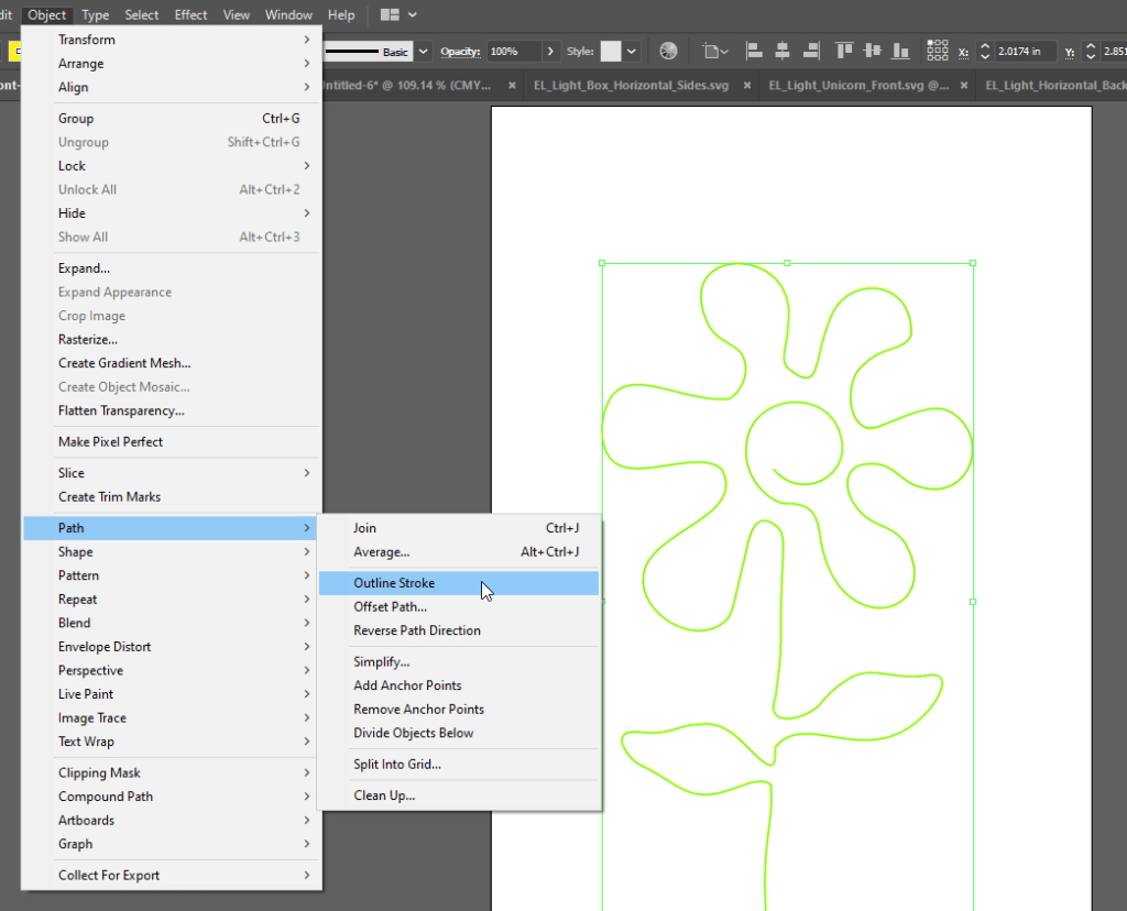 The process is pretty straight forward. Start with a single stroke line art. Measure the width of the sewing edge and subtract 0.12mm. Set the stroke width of the single stroke art to 0.83mm. Add circles at the end for the wire to poke through. Unit with pathfinder. Cut.