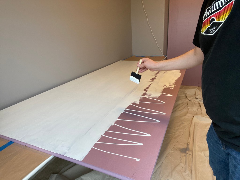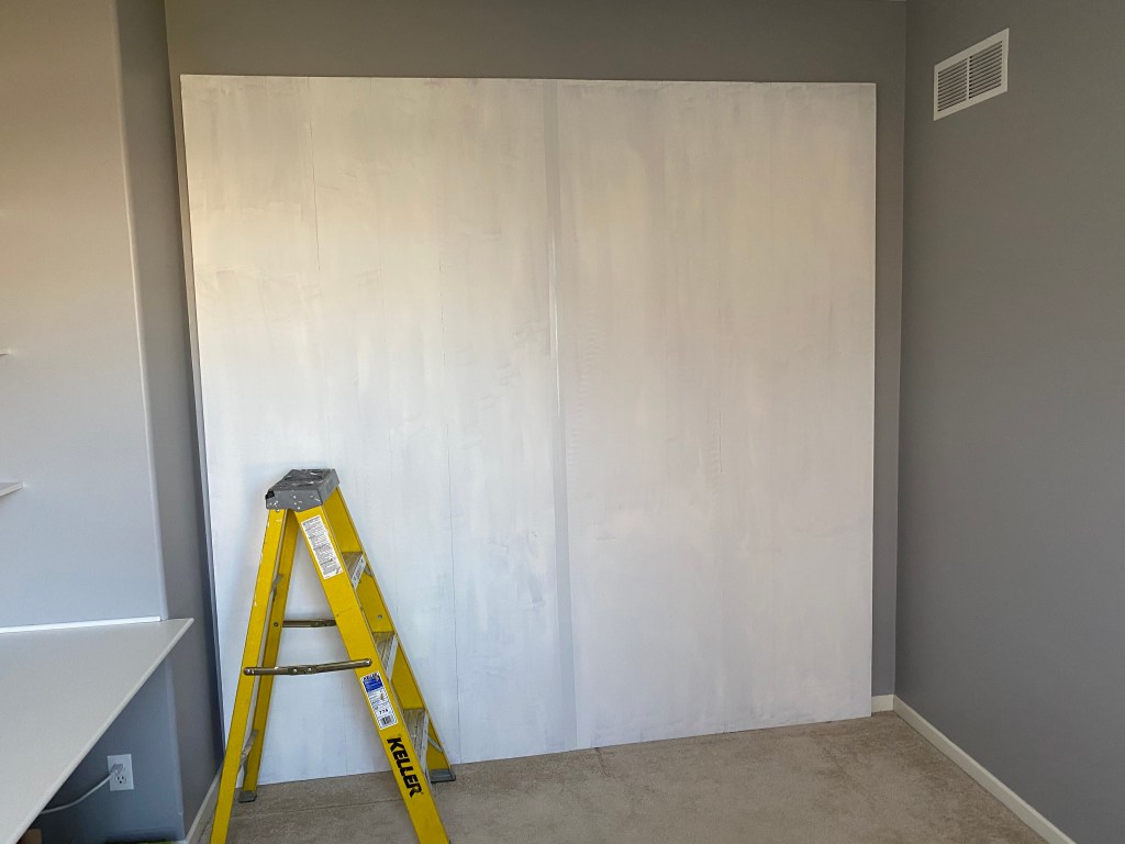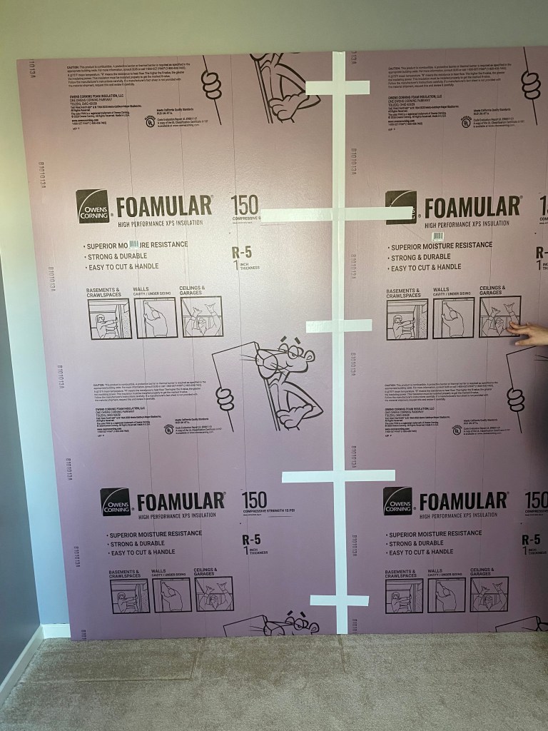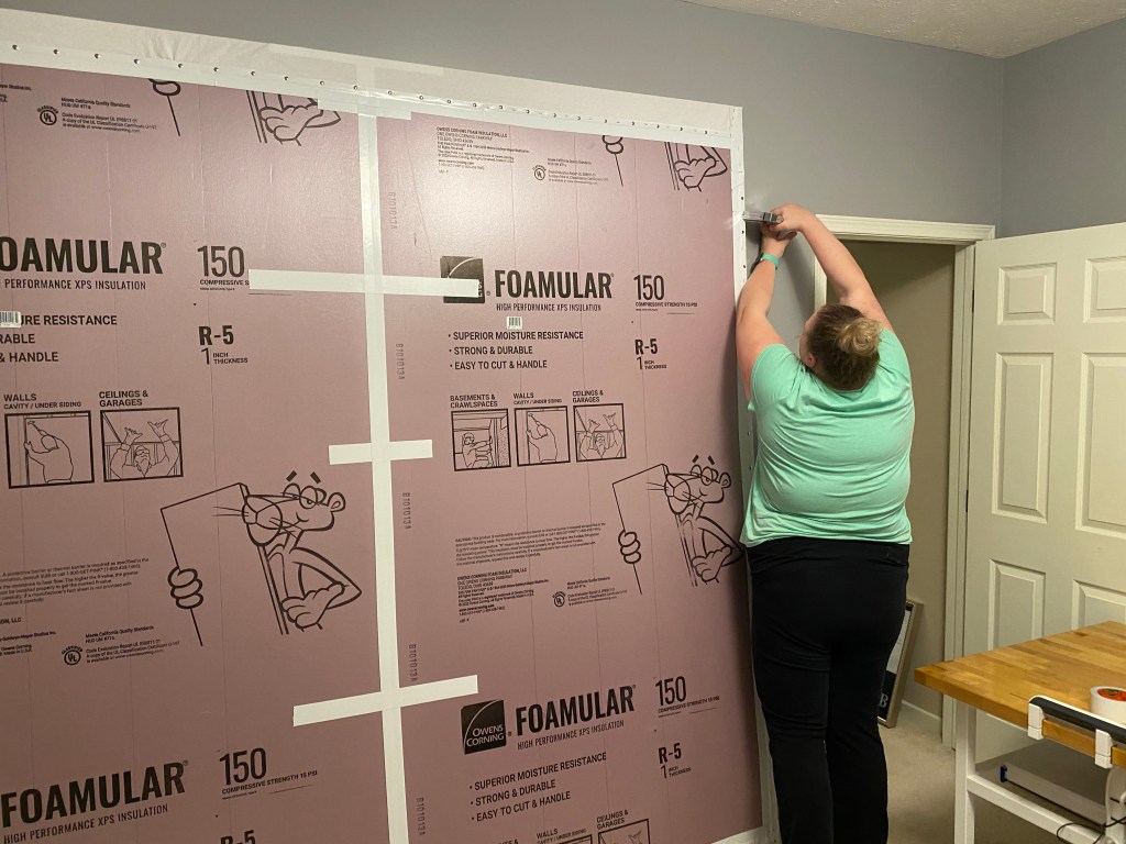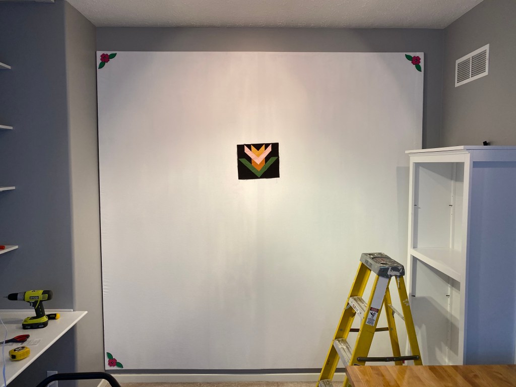 The core of the design wall is 2 sheets of 1 inch thick extruded polystyrene insulation board from Home Depot. It’s covered with a white flannel sheet. To keep make everything appear an even color when it’s done, I painted the non-printed side white of the insulation board, then taped the insulation board together with white gorilla tape. The printed side will face the wall. The flannel sheet is wrapped around the edges, taped on the back with gorilla tape, then stapled through both tape and sheet.