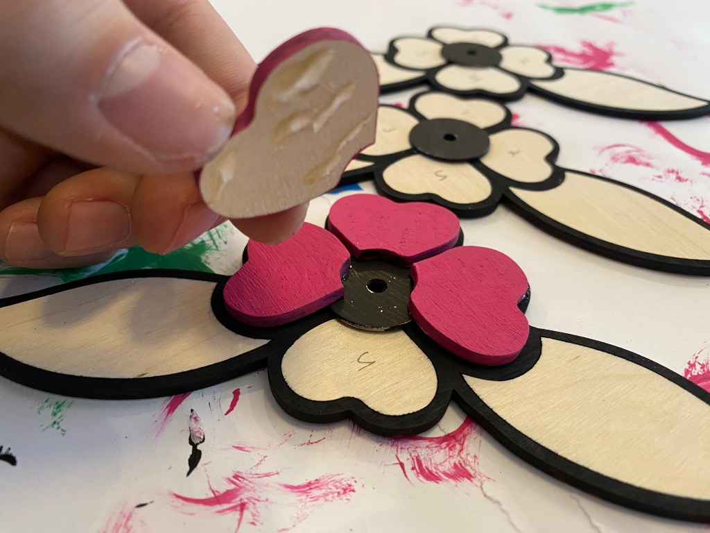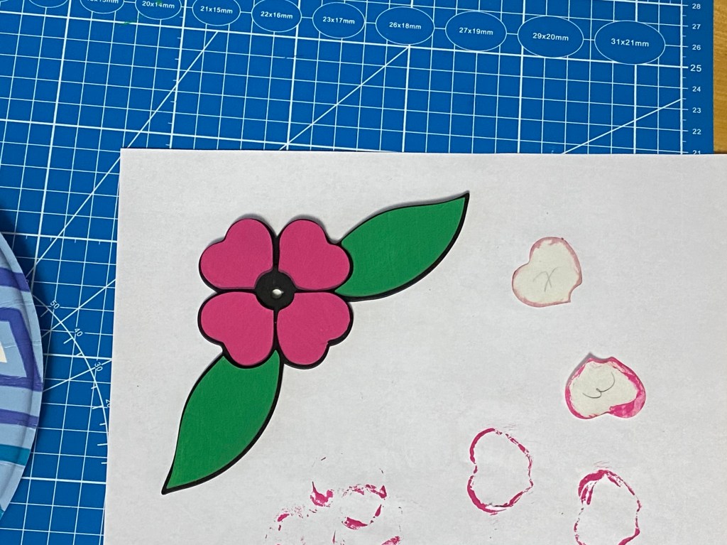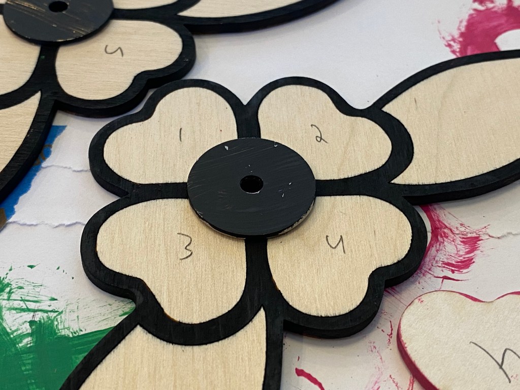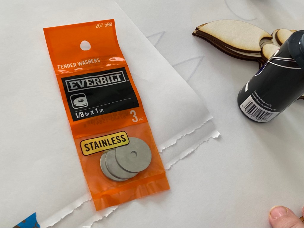 Just running a screw through the insulation board won’t work because it would just pull through and fall off the wall. A washer is required to spread the clamping force across a larger surface. Instead of using a plain washer, we cut some floral corners to disguise the washer.