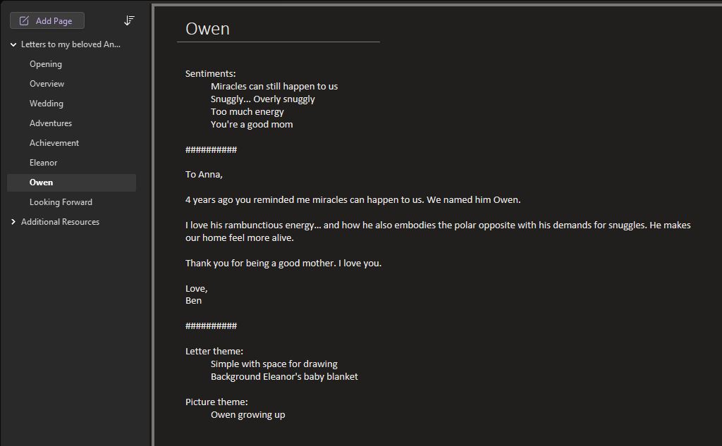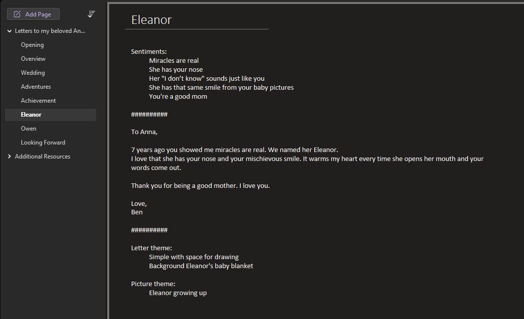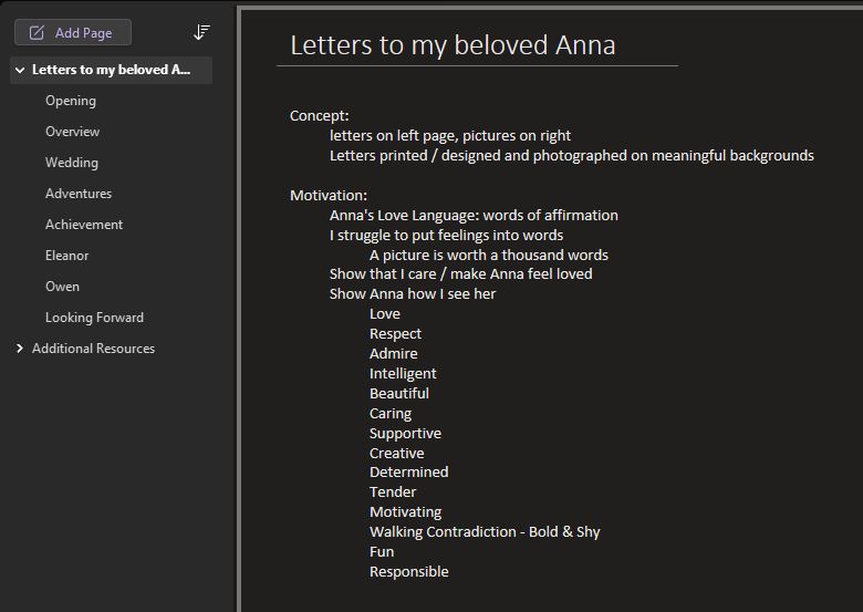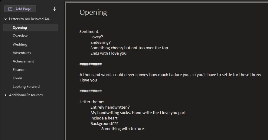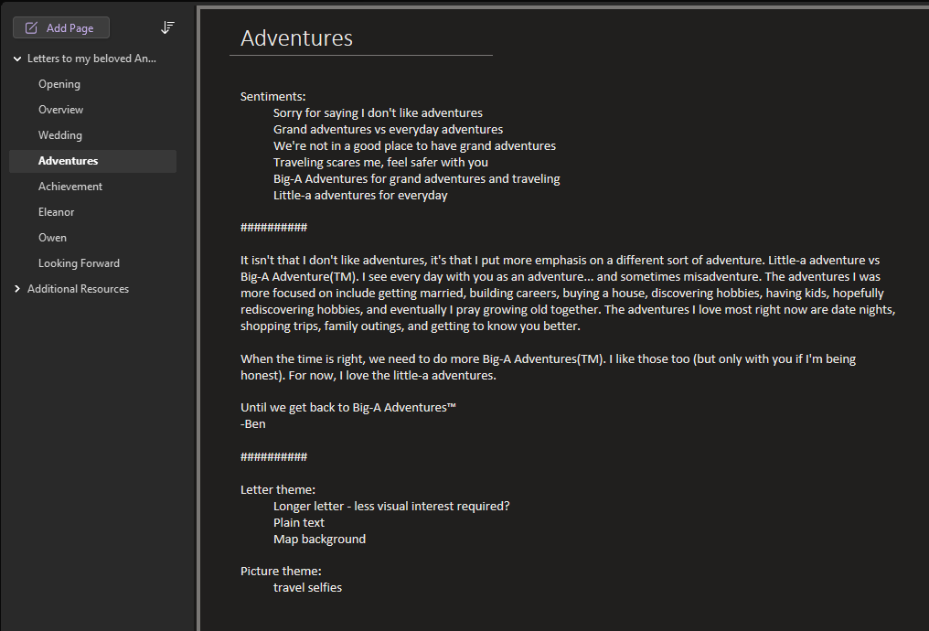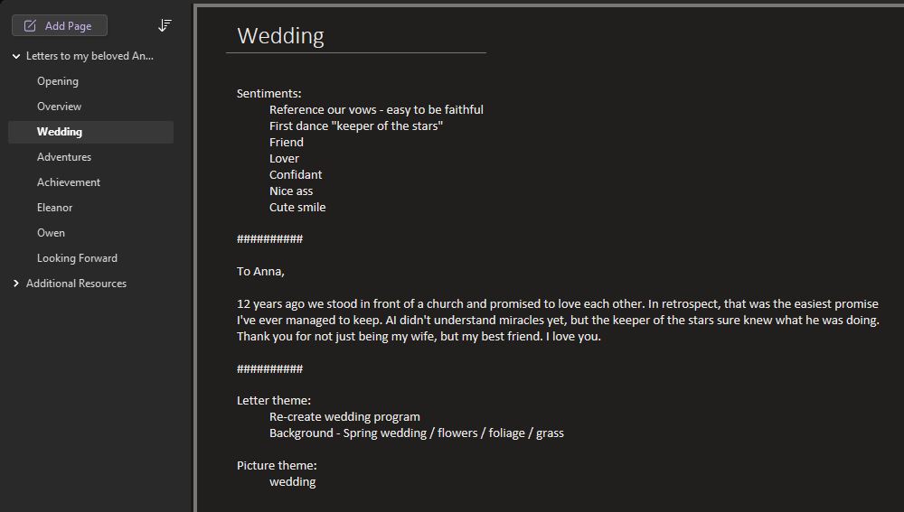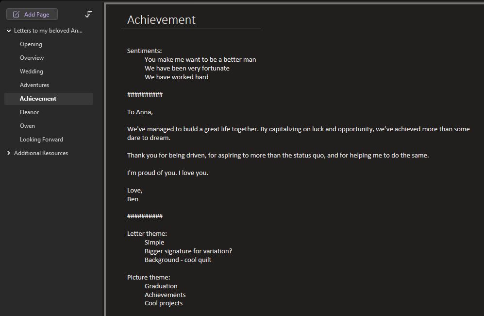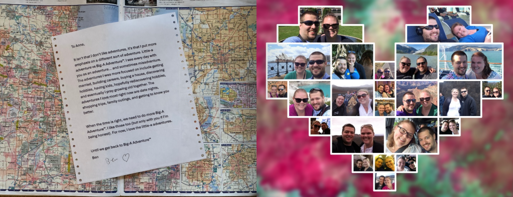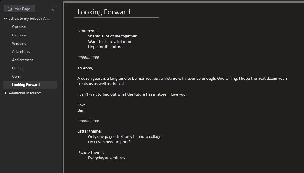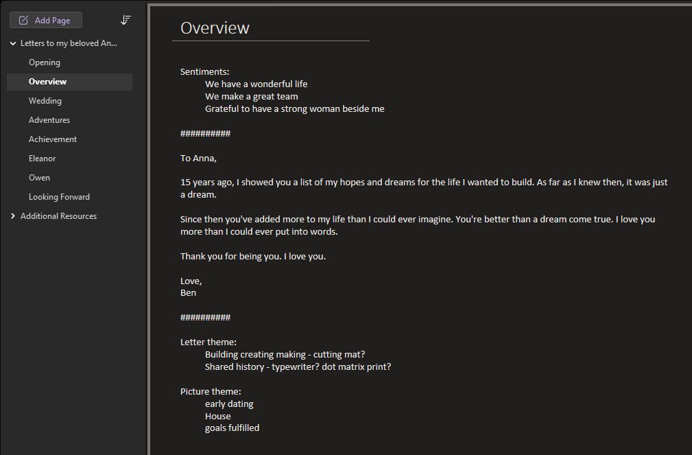 As is usual, it turns out I was overthinking it. I assume if you’re reading this, you already have romantic thoughts. Just write them down in your preferred notes app. Revisit as you have time. The letters don’t need to be long or elaborate, just heartfelt. 7 or 8 letters, typed or handwritten is plenty. Add in a few dozen pictures to make it visually appealing and more personal.